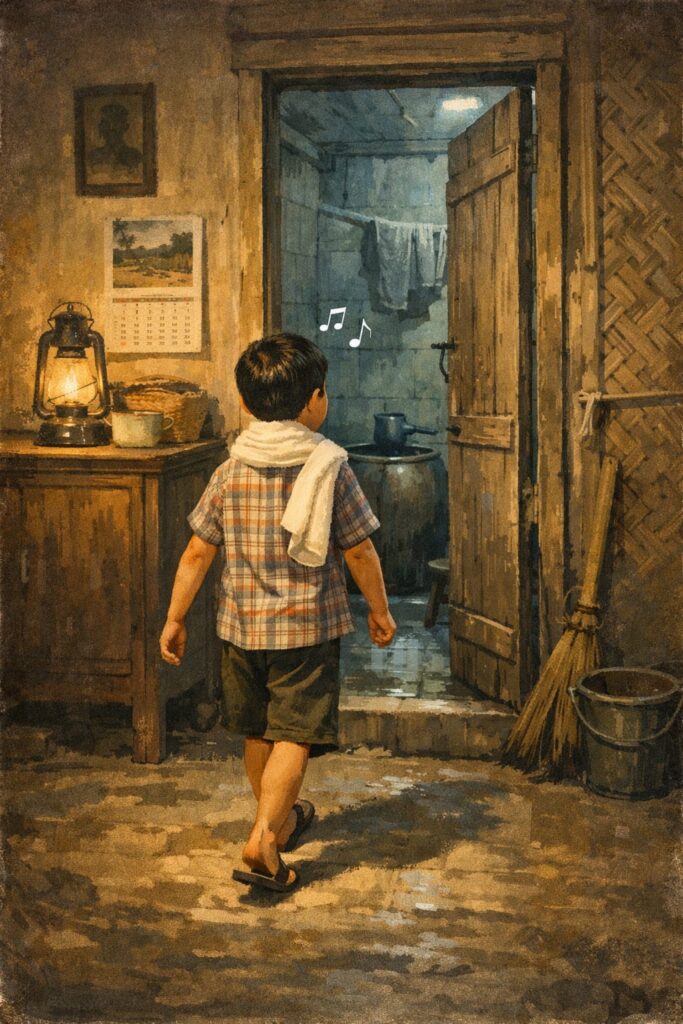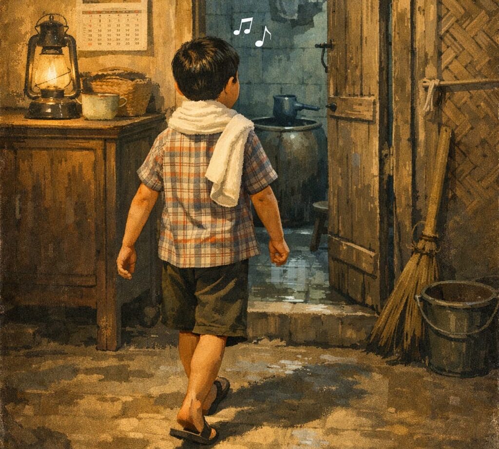 Bagi anak-anak, larangan itu terdengar aneh. Apa salahnya bersenandung sambil menyiram tubuh? Bukankah air mengalir, hati pun sedang riang?