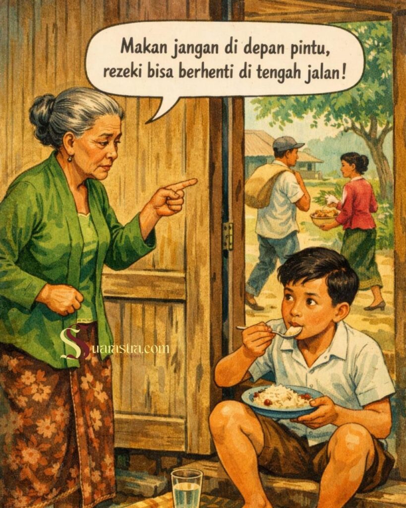 Larangan itu sejatinya bukan sekadar soal rezeki yang tersendat, melainkan cara halus orang tua mengajarkan adab. Pintu adalah jalan keluar-masuk rumah, tempat orang berlalu-lalang membawa urusan dan keperluan. Duduk makan di sana dianggap tidak tertib, menghalangi langkah, dan mudah menimbulkan ketidaknyamanan bagi orang lain.