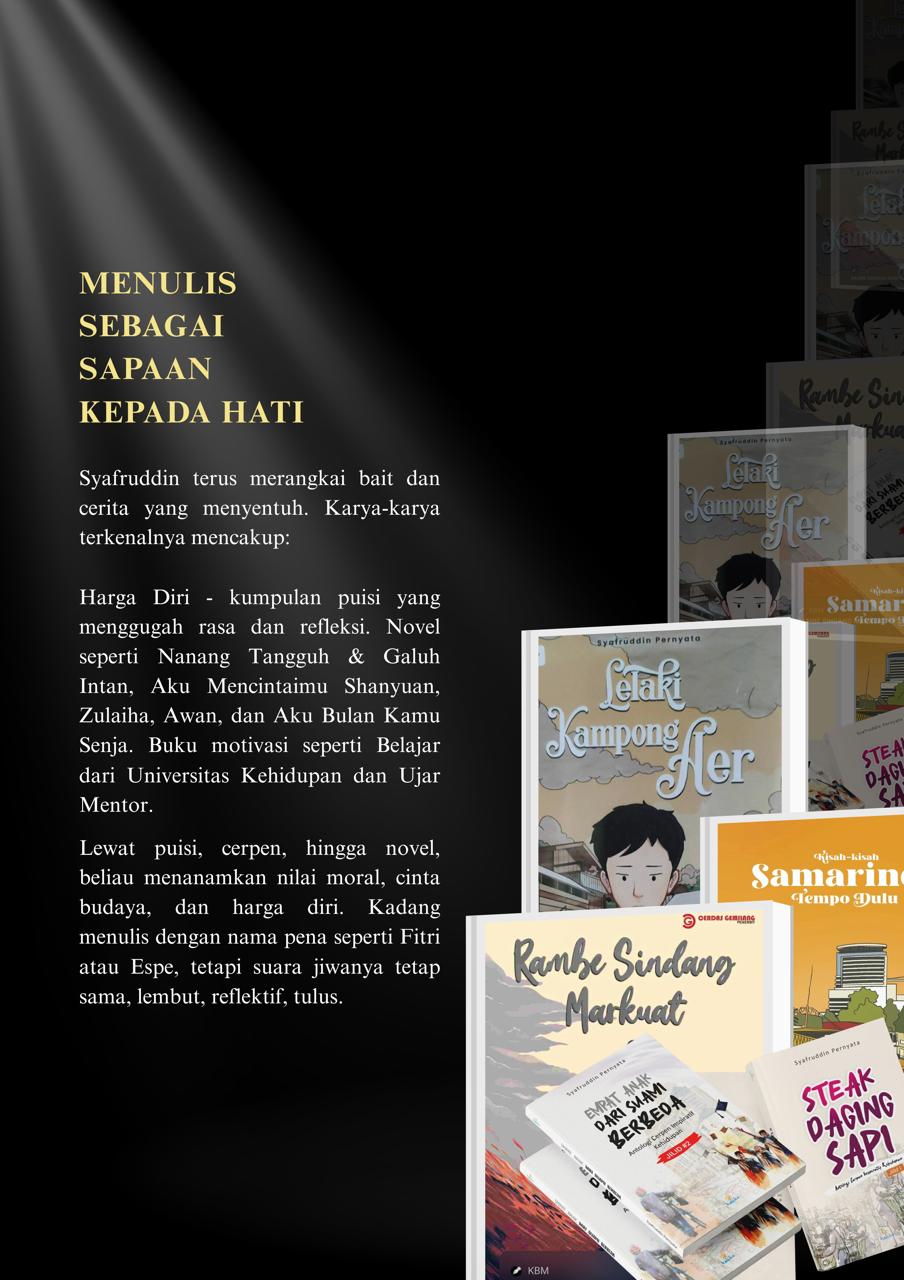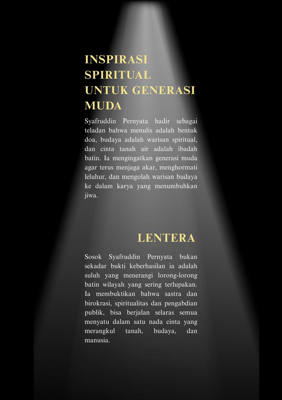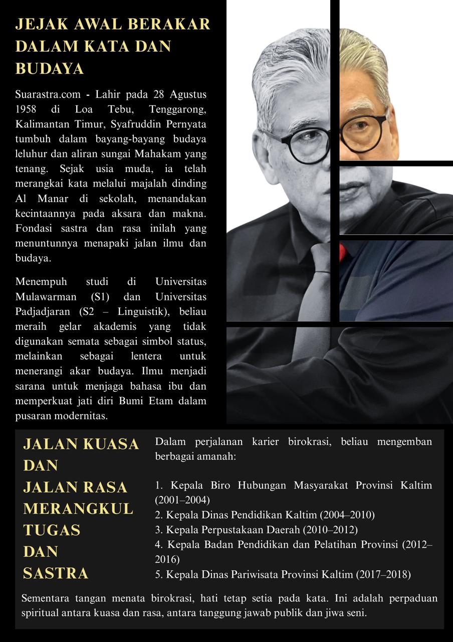 Syafruddin Pernyata adalah cermin seorang yang menyatukan dunia kata dan dunia kerja nyata. Ia lahir dari tanah Loa Tebu, tumbuh dengan semangat menulis sejak belia, lalu menempuh jalan panjang birokrasi tanpa pernah meninggalkan ruh sastranya.