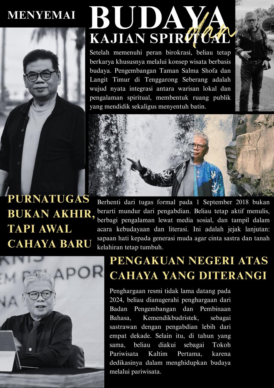Ia adalah saksi bahwa pena mampu berdiri sejajar dengan kuasa, bahwa sastra dan pelayanan publik dapat berjalan beriringan. Dari masa muda hingga purnatugas, ia tetap menjadi cahaya yang menuntun generasi untuk mencintai kata, menjaga budaya, dan menghormati leluhur.